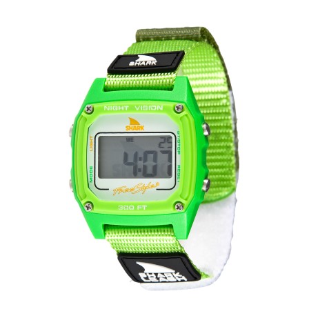 They're Back. The original Velcro band that ignited Freestyle Watches in the late 80's is back and better than ever. The shark leash's velcro closure system is modeled after an 80's style surfboard leash, and is ready to get radical. The Shark Leash comes loaded with standard digital features like time, date, stopwatch, countdown timer, alarm and night vision backlight. Like all Freestyle Watches, The Shark Leash is water resistant to 100 Meters and backed by our limited lifetime warranty. Shark to the Future!