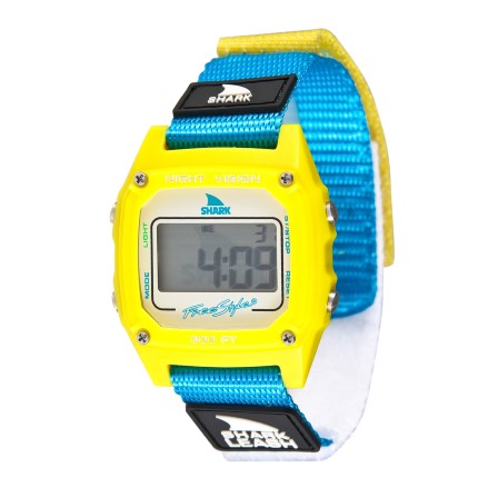 They're Back. The original Velcro band that ignited Freestyle Watches in the late 80's is back and better than ever. The shark leash's velcro closure system is modeled after an 80's style surfboard leash, and is ready to get radical. The Shark Leash comes loaded with standard digital features like time, date, stopwatch, countdown timer, alarm and night vision backlight. Like all Freestyle Watches, The Shark Leash is water resistant to 100 Meters and backed by our limited lifetime warranty. Shark to the Future!